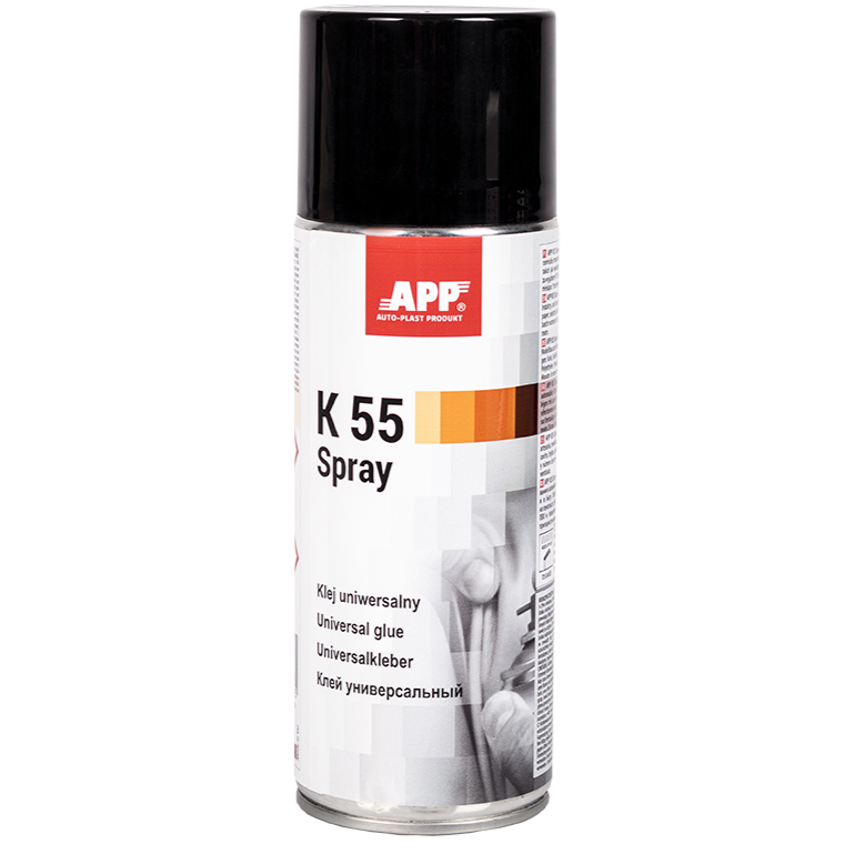 APP K 55 Spray ir ātra un universāla līme aerosolā, kas paredzēta lietošanai automobiļu rūpniecībā, amatniecībā, modeļu ražošanā un mājsaimniecībā. Ļauj līmēt ādu un dabiskos vai sintētiskos audumus, paklājus, papīru, kartonu, poliuretāna putas, plēves, koku un koksnes materiālus.
